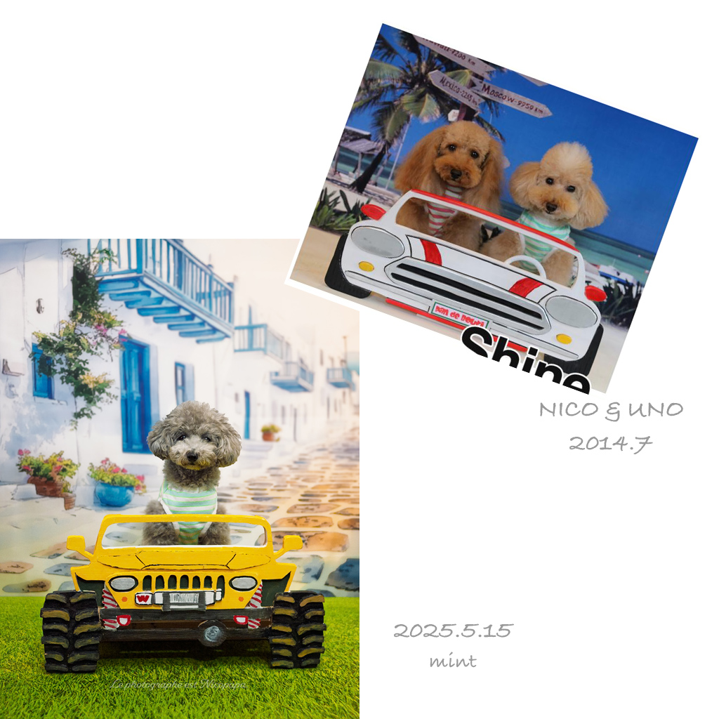 撮影セットが車ということだったので、11年前にNICOとUNOが撮影した時のお洋服をmintに着せて行きました。